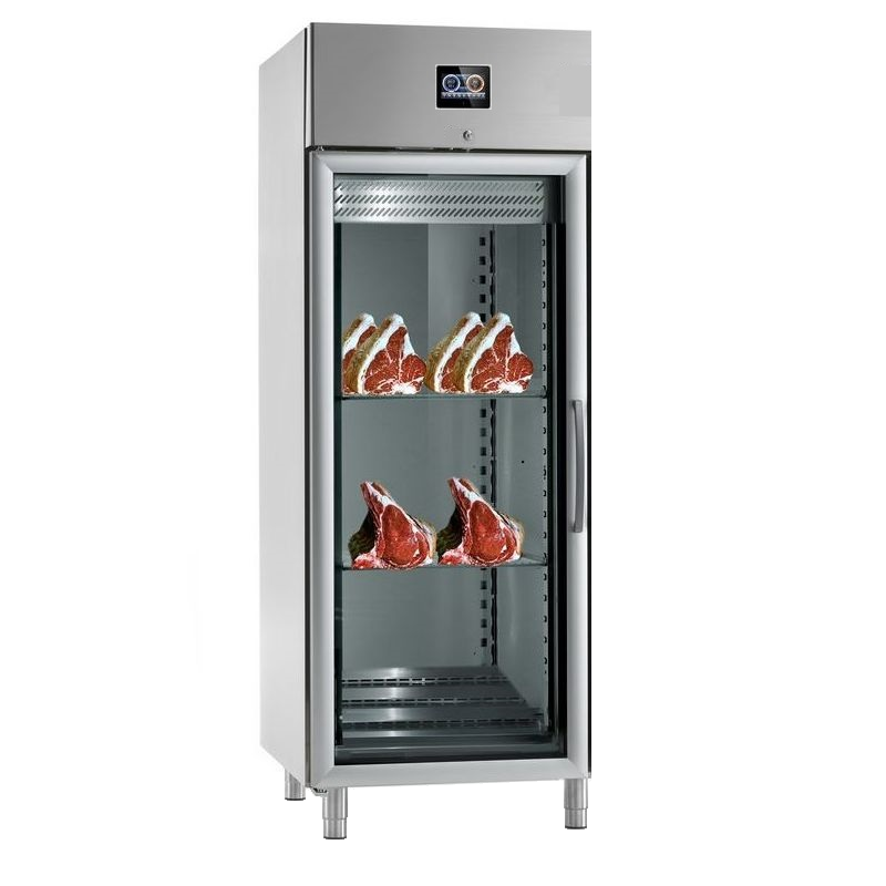 Armoire idéale pour la maturation de la viande de boeuf sur grilles inox GN 2/1. Proposée en 2 capacités: 700 litres 3 grilles, 1 porte pleine ou porte vitrée, 1400 litres 6 grilles, 2 portes pleines ou portes vitrées. Capacité de chargement: 90 Kg sur 3 grilles / 180 Kg sur 6 grilles.
