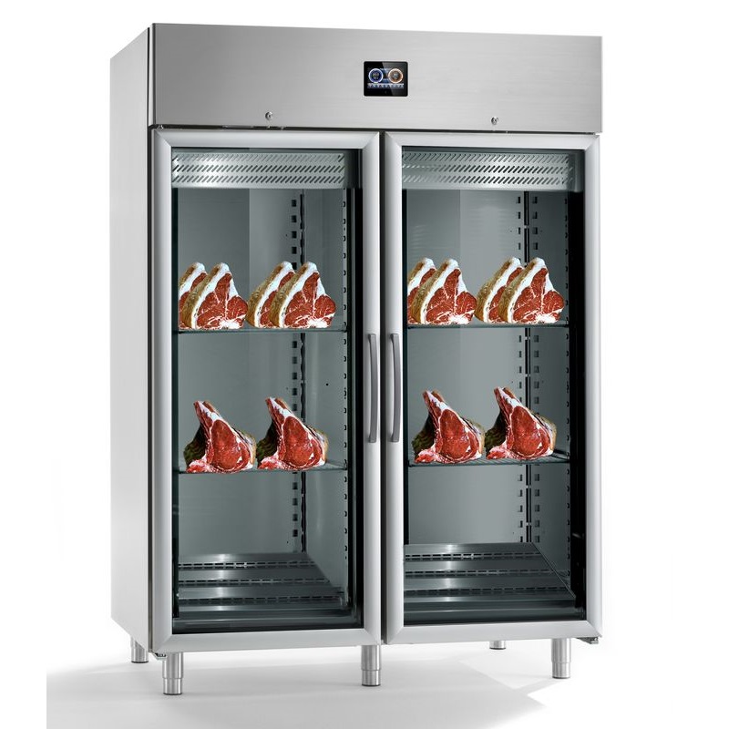 Armoires de maturation réfrigérées particulièrement adaptées à la maturation de viandes de boeuf sur grilles. 2 capacités, 700 litres 1 porte et 1400 litres 2 portes, dotées de 3 grilles inox GN 2/1 par porte. Poids toléré par porte 90 Kg. Froid ventilé, par gaine dorsale micro-perforée. Groupe en partie supérieure. Commande digitale, température et ventilation. Portes pleines inox ou portes vitrées…