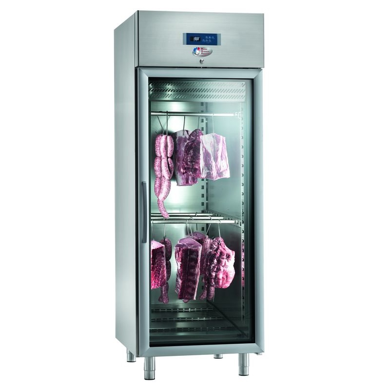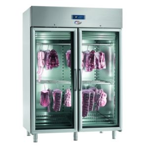 Armoire réfrigérée conçue pour la maturation de viandes de boeuf. Système d’accrochage sur barres de suspente en tube inox. 2 capacités, 700 litres 1 porte, 1400 litres 2 portes. Porte pleine ou vitrée. Armoire équipée de 6 barres de suspente repositionnables par porte. Construction inox 304. Isolation 75 mm. Froid ventilé réparti par gaine dorsale micro-perforée. Réfrigérant R 290. Dégivrage automatique…