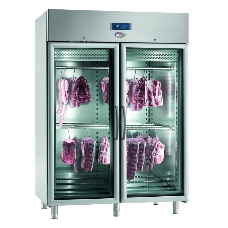 Armoire réfrigérée destinée à la maturation de viandes en suspension par crochets sur barres transversales inox. 2 x 3 barres par porte. 2 modèles d’armoires, de capacité 700 litres 1 porte ou capacité 1400 litres 2 portes. Portes pleines inox ou portes vitrées. Poids maximum toléré: 90 Kg par porte.