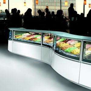 Vitrine canalisable permettant une grande variété d’agencements, disponible en 4 modules linéaires et 3 modules d’angle, en 2 hauteurs différentes. Conçue pour une grande capacité de présentation de glaces. Mise en valeur des produits par un design attractif, des surfaces transparentes, un plan d’exposition incliné de 9°, des éclairages LED, affichage des parfums avec LED lumineuses (brevet IFI).