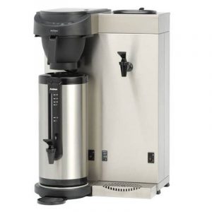 Combiné production de café filtre simple ou double et tirage d’eau chaude pour récipients thermos. Appareil fixe à remplissage automatique par raccordement au réseau d’eau. Livré avec thermos de 2,4 litres. Production maxi: 14 à 36 litres de café, 16 à 21 litres d’eau chaude / heure. Détection de récipient, anti-goutte, témoin d’entartrage, sécurité anti-fonctionnement à vide, alarme de fin de production…