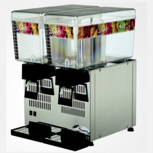 Distributeur de boissons fraiches à agitateur, pour la distribution de tous types de boissons: jus de fruits (avec ou sans pulpe) – sangria – limonade – eau – thé glacé – café froid… etc. Capacité de cuve 12 litres. Modèles de 1, 2 et 3 cuves. Utilisation simple, par appui du contenat sur le levier en façade. Système d’agitateur à palette pour un maintien à température homogène en évitant la formation de mousse et l’oxydation de la boisson. Système de réfrigération fiable et performant: condenseur de grande dimension pour un refroidissement rapide de la boisson et compresseur hermétique haute pression garantissant la performance et la durée de vie de l’appareil, particulièrement adapté aux régions chaudes. Système de réfrigération forcée par passage d’air de l’avant vers l’arrière avec ventilateur spécifique améliorant le rendement. . Système de récupération des eaux de condensation. Thermostat de régulation thermique automatique. Sécurité thermique par protecteur intégré au compresseur.