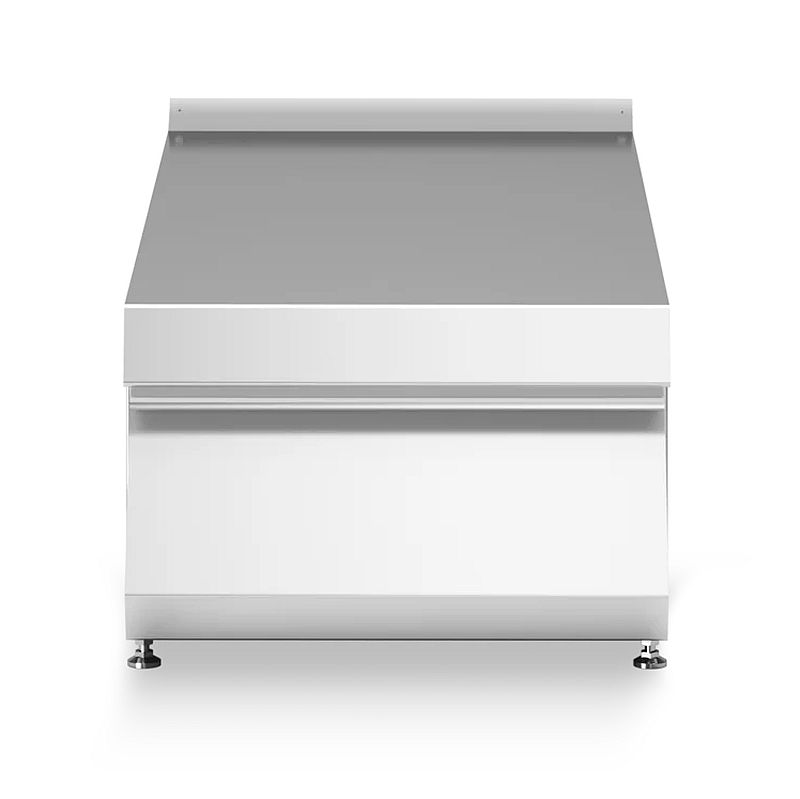 Modules sur rangement ou éléments dessus seul à poser de la gamme Modular Roc 900. Dessus plan de travail neutre, avec tiroir. Proposés en largeurs 400 et 800 mm. Installation « en pont » entre modules de cuisson de la même gamme (dessus « Top ») ou à positionner en extrémités ou dans un linéaire de cuisson ( modules avec pieds inox sur placard ouvert ou fermé). Alignement horizontal et vertical parfait dans la continuité du fourneau grâce au double système de jonction entre modules. Structures tiroirs avec guides en acier inoxydable montés sur glissières à extension complète, démontables pour le nettoyage, prévues pour recevoir un bac gastronorme de profondeur maximale 100 mm. Façades de tiroirs dans la continuité de profil de la gamme Roc 900.