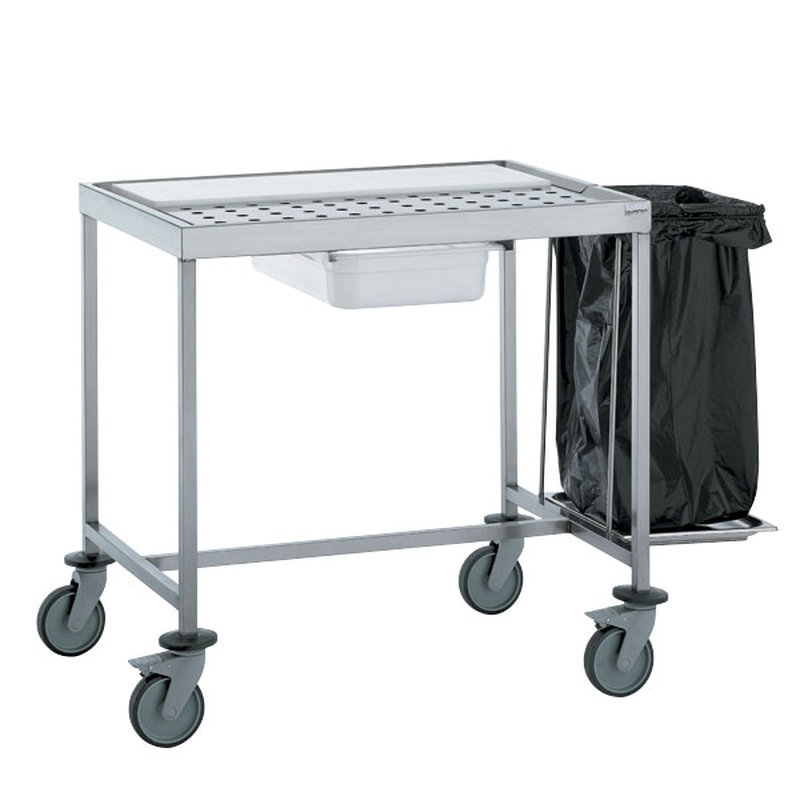 Chariot conçu pour la préparation de l’ensachage des produits à conditionner sous vide. Construction en acier inoxydable de qualité alimentaire à teneur en chrome supérieure à 17,5%. Structure en tube inox carré de section 25 x 25 mm avec traverses latérales et longeron en partie basse assurant la rigidité du chariot. Plan de travail supérieur en inox épaisseur 12/10 ème, en décaissé composé d’une plaque de découpe polyéthylène de 25 mm d’épaisseur et d’une grille inox perforée. Tous angles rayonnés.1 bac tiroir de récupération en polyéthylène, au format GN 1/1 monté sur glissières (bac fourni). 1 porte sacs avec plateau et montants inox, crochetable sur le rebord du plan de travail. Chariot doté de 4 roues orientables à chape polyamide, de diamètre 125 mm, avec butoirs de protection. Deux roues avec frein.