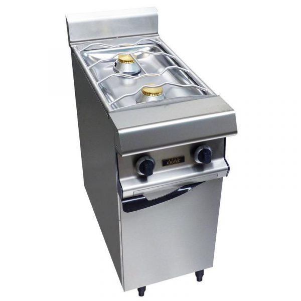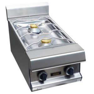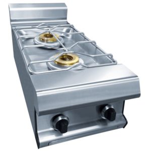 Demi bloc de cuisson dessus 2 feux nus. Brûleurs gaz démontables à flamme pilotée, puissance unitaire 6 kW. Grilles de feux en cadre fil inox de dimensions 400 x 600. Sur cuvette emboutie pour la facilité de nettoyage, avec tiroir de propreté. Sécurité par veilleuse et thermocouple. Manettes de commandes sécurisées et protégées.