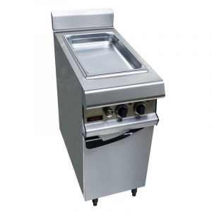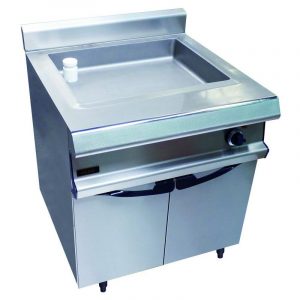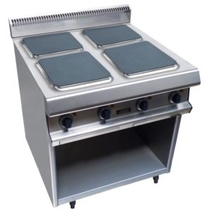 Dessus en acier inoxydable 18/10 brossé. Epaisseur du dessus 30/10. Habillage en acier inox épaisseur 10/10. Structure épaisseur 20/10 en acier inoxydable. Plateau du dessus en débord avec bord avant tombé rayonné de 20. Dosseret arrière avec mitre d’évacuation des gaz brûlés. Façade sans vis apparentes. Piétement vérin composite de 150 mm réglable. Commandes « rentrées » sous plateau supérieur, protégées des projections. Façade sans vis apparentes.
