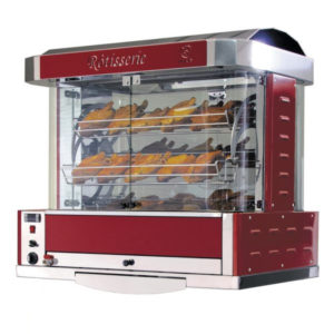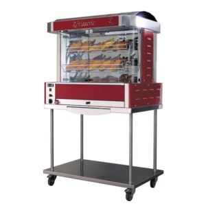 Rôtissoire à balancelles électrique à poser sur plan de travail ou sur support mobile. Construction intérieur et extérieur tout acier inox. Equipée de 6 balancelles en fil d’acier inox, pour une capacité maximale de 36 volailles de 1,2 Kg.