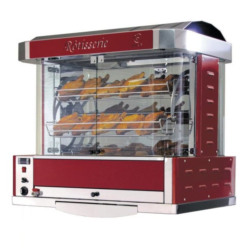 Rôtissoire panoramique, avec visibilité des cuissons sur les 4 côtés. Accès service sur 2 faces, par portes battantes droites en verre, angles de rôtissoire en verre bombé à 90°. Balancelles offrant la possibilité d’inclure des plateaux traiteur (non fournis). Plat de récupération des jus de cuisson et à pommes de terre extractible en inox en partie basse, avec poignée en façade, et vanne de vidange. Tablette de service coulissante. Filtre et toit inox piégeant les graisses. Système de chauffe par résistances épingle avec thermostat manuel et sécurité de chauffe. Réglage électronique de la température de cuisson, indice de protection IP65. Eclairage intérieur intensif à quartz 2000 W. Rôtissoire proposée en version seule à poser, ou sur support mobile inox avec étagère basse et 4 roues orientables dont 2 avec frein.