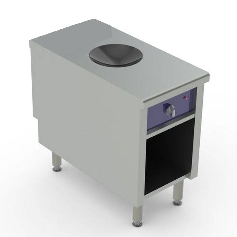 Demi module « annexe » électrique intégrable à la gamme modulaire Pro. Dessus 1 foyer en hémisphère type wok sous verre vitrocéramique de forte épaisseur et haute résistance aux chocs permettant l’utilisation d’ustensiles de cuisson à forme sphérique (non fournis). Foyer de diamètre 300 mm, puissance 5 kW chauffé par bloc inducteur en sous face, ventilé, intégré au dessus, affleurant. Pilotage par manette de réglage de puissance sur tableau de commande en acier émaillé, protégé des projections par un décalage intérieur par rapport au rebord du dessus. Thermostat de réglage par potentiomètre à 12 niveaux, avec repères sérigraphiés, avec tthermostat de sécurité (protection contre la surchauffe). Témoin de fonctionnement et chauffe, et témoin de dysfonctionnement, code erreur.