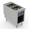 Demi module annexe de la gamme Pro 1000 Charvet – Dessus plaque de cuisson coup de feu en fonte avec tampon excentré. Dimensions de la plaque: 495 x 700 mm. Soubassement rangement ouvert avec plancher. Plaque affleurante sur dessus avec encadrement en acier inoxydable AISI 304 de 30 mm d’épaisseur, avec bord tombé droit de 55 mm et contrepli. Chauffage par brûleur de type couronne de puissance 10,5 kW avec veilleuse et sécurité par thermocouple. Répartition de la température assurée par éléments réfractaires amovibles dans un coffrage inox. Commande par robinet à 4 positions – arrêt, allumage, plein feu, ralenti – à rattrapage de jeu. Tiroir de propreté en acier inoxydable 18/10 en façade. Panneau de commande émaillé.