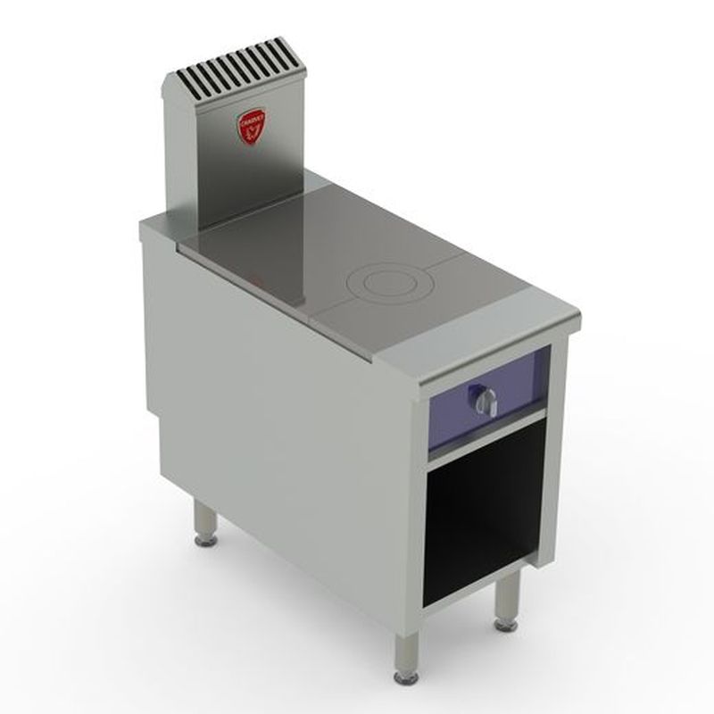 Demi module annexe gamme Pro 1000 Charvet. Dessus plaque de cuisson « coup de feu » en fonte, avec tampon excentré, affleurante au dessus inox 30/10°. Alimentation gaz. Bouton de commande quatre positions à rattrapage de jeu. Veilleuse et sécurité thermocouple. Chauffage par brûleur couronne et éléments réfractaires amovibles. Tiroir de propreté inox. Sur placard ouvert…