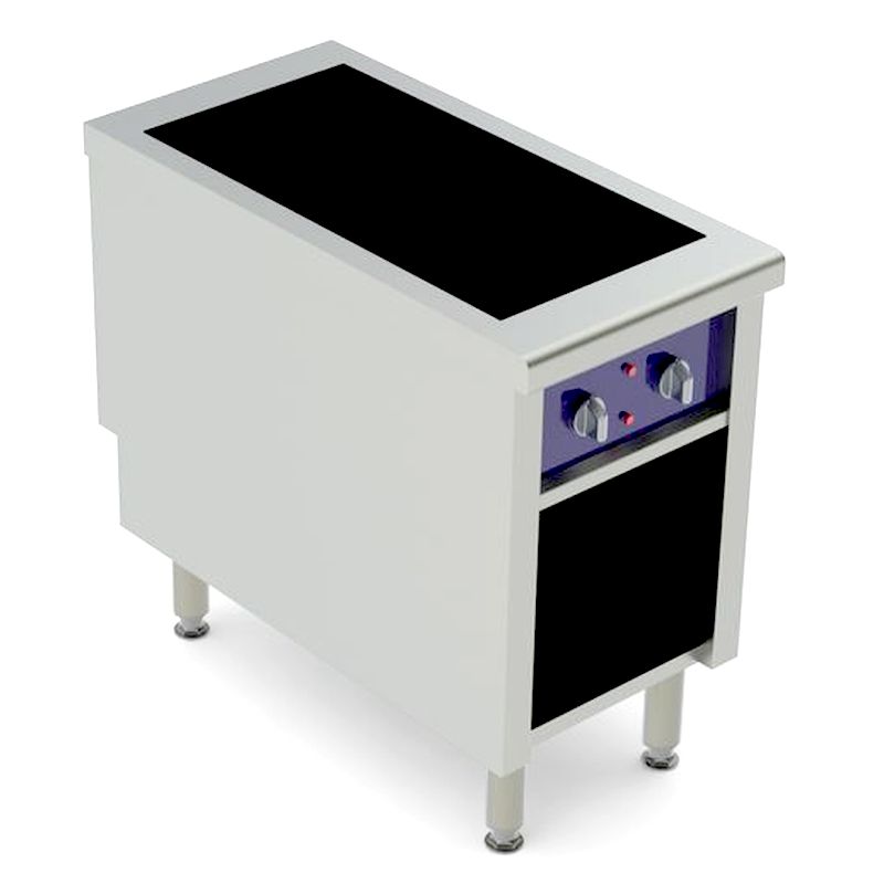 Demi modules gamme 1000 Charvet, largeur 500 mm. Dessus plaques de cuisson carrées en fonte blindées. Deux modèles: plaques 400 x 400 mm ou plaques 300 x 300 mm. Affleurantes sur dessus inox AISI 304 de 30/10° d’épaisseur. Commandes individuelles sur tableau en acier émaillé en façade, commutateurs 3 allures, limiteurs de température et voyants de marche. Soubassement rangement ouvert…