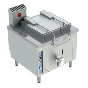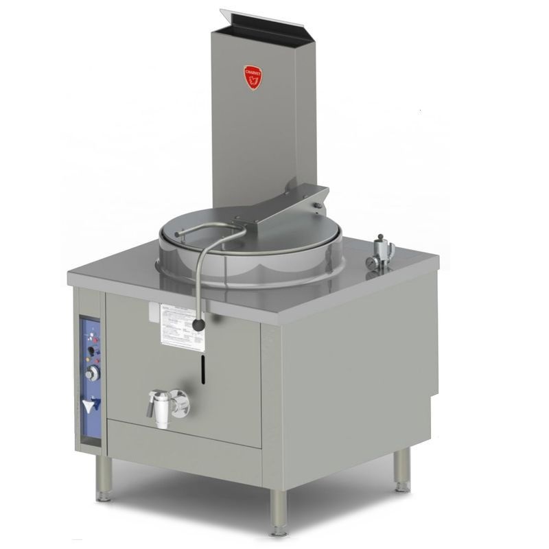 Construction en acier inoxydable. Châssis porteur AISI 304 de 10 à 30/10° d’épaisseur, assemblé par soudures électriques haute intensité. Encadrement du dessus en inox AISI 304 de 30/10° d’épaisseur, à bord droit tombé de 55 mm avec contrepli. Cuve à panache chaudronnée, parois en acier inoxydable AISI 304 de 30/10° d’épaisseur, fond bombé et penté en acier inoxydable 316L (cuissons de salaisons, etc). Angles horizontaux arrondis, crépine inox amovible, vidange en façade par robinet en bronze chromé à poignée rabattable. Double enveloppe inox AISI 304 épaisseur 30/10° avec soupape de sécurité à 330 gr. Remplissage par robinet 3 voies (raccordement sur adoucisseur recommandé). Vidange par rejet en caniveau. Couvercle en acier inox AISI 304 de 15/10° d’épaisseur, avec charnière à ressorts permettant le maintien en position ouverte, et poignée de maoeuvre en tube inox avec embout en matériau athermique. Commandes facilement accessibles, sur bandeau vertical émaillé à gauche en façade de l’appareil.
