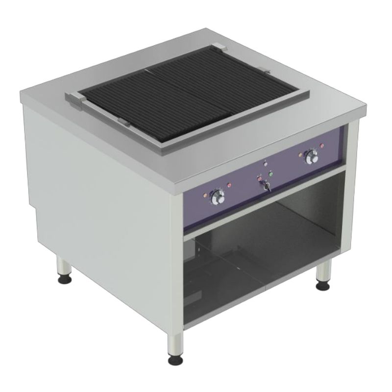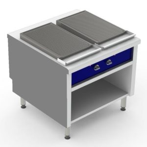 Modules simple service gamme Pro 1000. Dessus 2 plaques grils en fonte. 3 versions: 2 plaques fonte nervurées, soubassement baie libre – 2 plaques fonte nervurées, soubassement four électrique – 2 grilles fonte nervurée sur bac à eau, soubassement baie libre. Energie électrique.