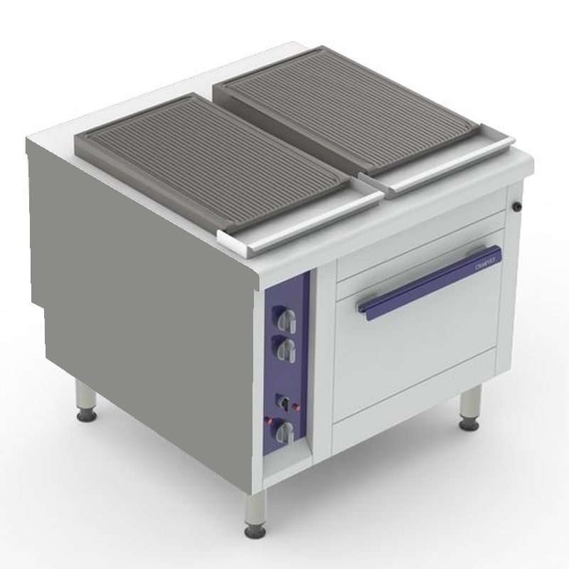 Modules gamme 1000, largeur 1000, dessus plaques grils nervurées. 3 modèles: 2 grils fonte nervurés sur four, 2 grils fonte nervurés sur baie ouverte, 2 grils fonte barreaudés sur cuvette à eau, sur baie ouverte. Chauffage électrique. Four électrique statique 3 niveaux 800 x 600 (2EN) sole acier de 6 mm d’épaisseur. Construction sur châssis inox AISI 304. Dessus (encadrement des plaques) en 30/10° d’épaisseur…