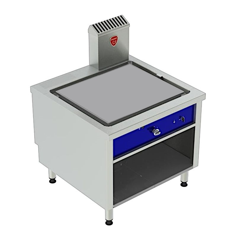 Bloc modulaire gamme 1000. Alimentation gaz. Dessus plaque lisse affleurante en fonte de type plancha (cuisson contact), De 20 mm d’épaisseur, avec ou sans revêtement au chrome. Sur placard baie ouverte avec plancher amovible. Surface de cuisson utile 800 x 680 mm. Gorge d’évacuation des graisses de cuisson périphérique, avec ruissellement d’eau . Chauffage par brûleur multirampes, allumage électrique…