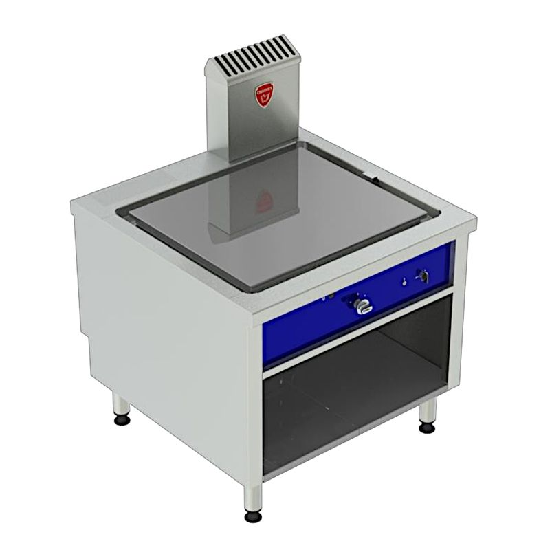 Bloc modulaire simple service gaz. Dessus plancha lisse (plaque de cuisson contact). Soubassement rangement ouvert avec plancher inox. Deux versions: plaque lisse en fonte ou plaque chromée. Dimensions de la surface de cuisson 800 x 680 mm, épaisseur de la plaque 20 mm. Puissance gaz 20 kW.