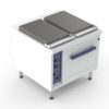 4 foyers sous plaques en fonte – 4 zônes de chauffe, sous plaques coup de feu en fonte de 790 x 670 mm. Chauffage par résistances 4 x 4 kW avec thermostat 50°/500°, limiteur de température. 4 commandes indépendantes par bouton doseur d’énergie, commutateurs avec voyants de fonctionnement de mise sous tension et de chauffe.