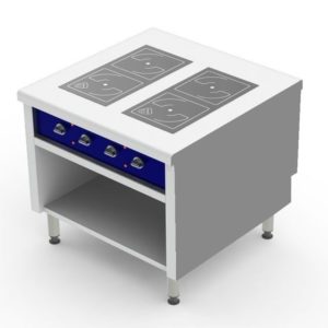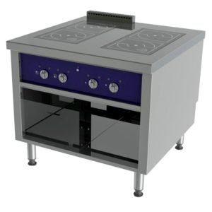 Fourneaux simple service électrique gamme 1000. Sur baie libre rangement ouvert avec plancher. Dessus plaques chauffantes. 3 modèles: 4 zônes de chauffe sous plaques chauffantes en fonte (4 x 4 kW), 4 foyers rayonnants sous plaque vitrocéramique (4 x 4 kW), 4 foyers induction sous plaque vitrocéramique (4 x 5 kW). Commandes individuelles avec doseurs d’énergie et thermostat de sécurité. Construction acier inoxydable AISI 304…