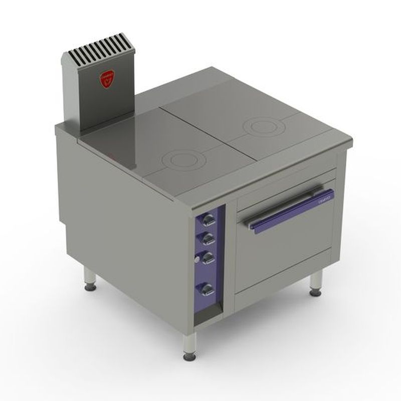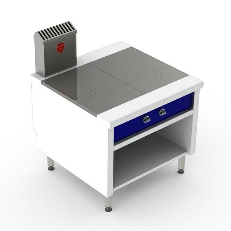 Dessus: plaque de cuisson en fonte en 2 éléments de 496 x 700 mm, avec tampon excentré. Brûleurs de type couronne, puissance unitaire 10,5 kW avec veilleuse et sécurité par thermocouple. Commandes individuelles par robinets « arrêt – allumage – plein feu – ralenti » à rattrapage de jeu. Eléments réfractaires amovibles dans coffrage inox. Tiroir de propreté en inox 18/10.