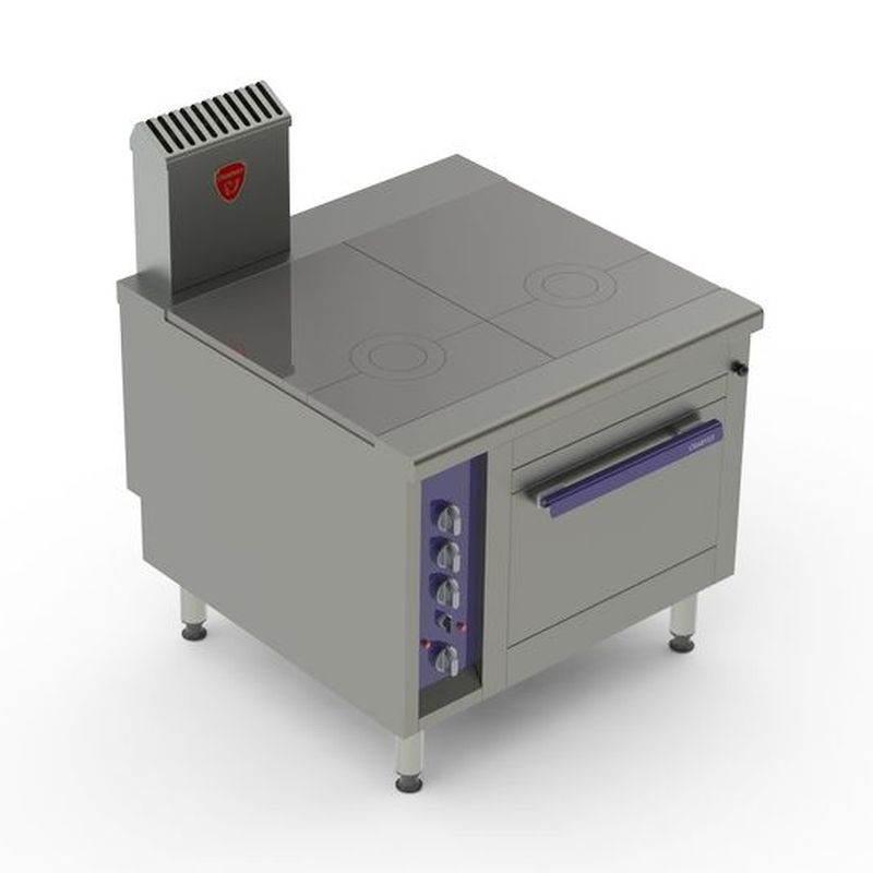 Soubassements: four statique gaz ou électrique. Dimensions 600 x 800 x h 300 mm. Sole acier d’épaisseur 6 mm, moufle acier inoxydable avec isolation haute densité. 3 niveaux de glissières avec espacement de 70 mm, sur supports acier émaillé amovibles. Porte et contre porte avec isolation haute densité. Poignée en acier émaillé sur supports en aluminium anodisé assurant la coupure thermique. Four gaz: brûleur en acier émaillé de type H. Puissance 14 kW, avec veilleuse et sécurité par thermocouple. Commande par robinet « arrêt – allumage – marche ». Thermostat de réglage 50°/300°C. Four électrique: chauffage de sole et voûte par résistances électriques, puissance 6 kW. Commutateur à 6 positions et thermostat de régulation 50°/300°C. Voyants de mise sous tension.