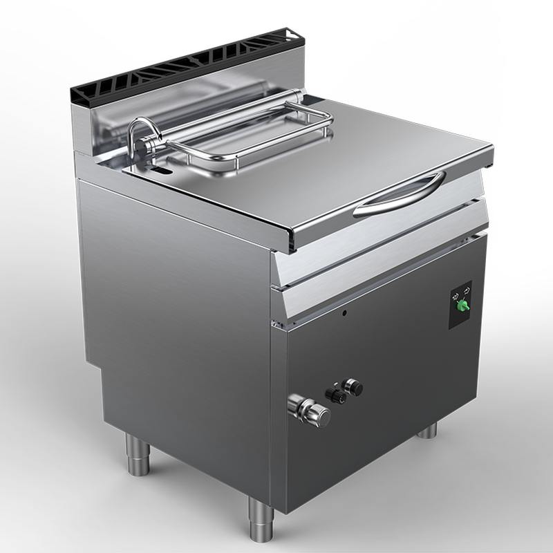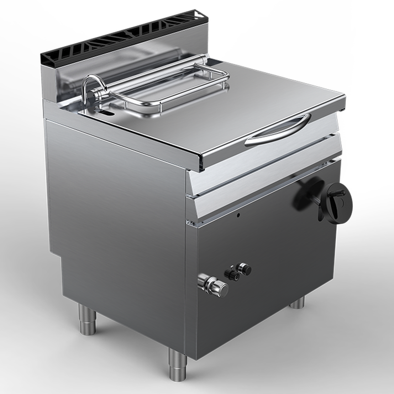 Sauteuse basculante gaz série 700. Capacité 50 litres, surface de cuisson 31 dm². Alimentation gaz. 2 options: basculement manuel de la cuve par bouton moleté en matériau athermique et vis sans fin ou basculement motorisé avec commande en façade..