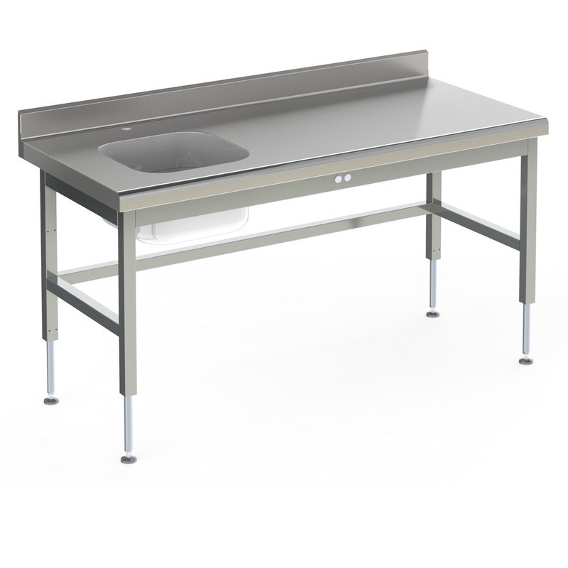 Table inox à plateau réglable en hauteur. Dessus avec bac du chef 400 x 400 x h 250 mm (sans robinetterie). Dosseret arrière. Réglage de la hauteur du plan de travail de 700 à 1100 mm pour l’adapter à la taille des utilisateurs en évitant les troubles musculo-squelettiques et en réduisant la pénibilité de postes de travail. Construction tout inox. Commandes de montée et descente électriques…