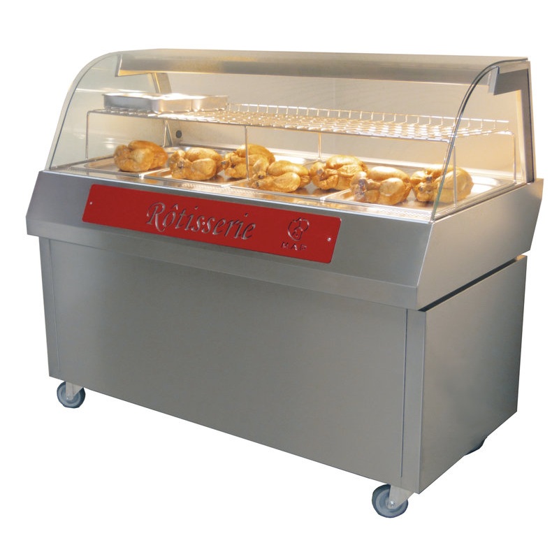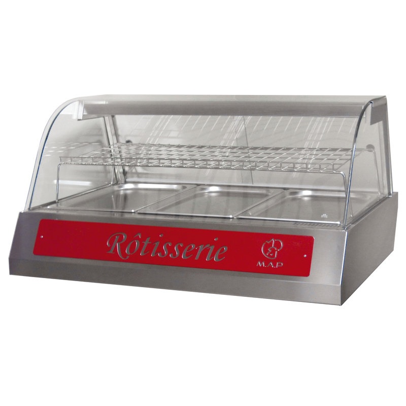 Les vitrines MAP Hot sont le complément indispensable des rôtissoires. Elles ont pour fonction de présenter avantageusement les produits rôtis prêts à la vente tout en les maintenant à température. Gamme proposée en 3 capacités de 2, 3 et 4 bacs gastronormes GN 1/1 (bacs fournis), en vitrine dessus seul à poser ou sur meuble support mobile (pour les vitrines 3 et 4 bacs uniquement). Alimentation électrique en 230 Volts.