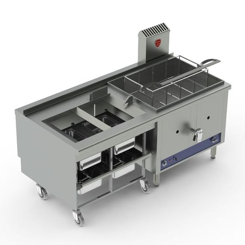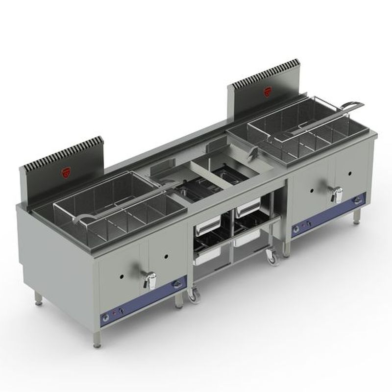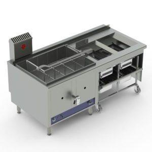 Friteuses gaz haut rendement à zône froide, capacité de cuve 80 litres. 3 configurations (production en frites précuites surgelées 6X6): friteuse seule à vidange en façade, rendement 70 Kg/heure – friteuse à transfert avec 1 silo positionné à droite ou à gauche, rendement 80 Kg/heure – friteuse à transfert 2 x 80 litres avec silo central, rendement 160 Kg/heure.