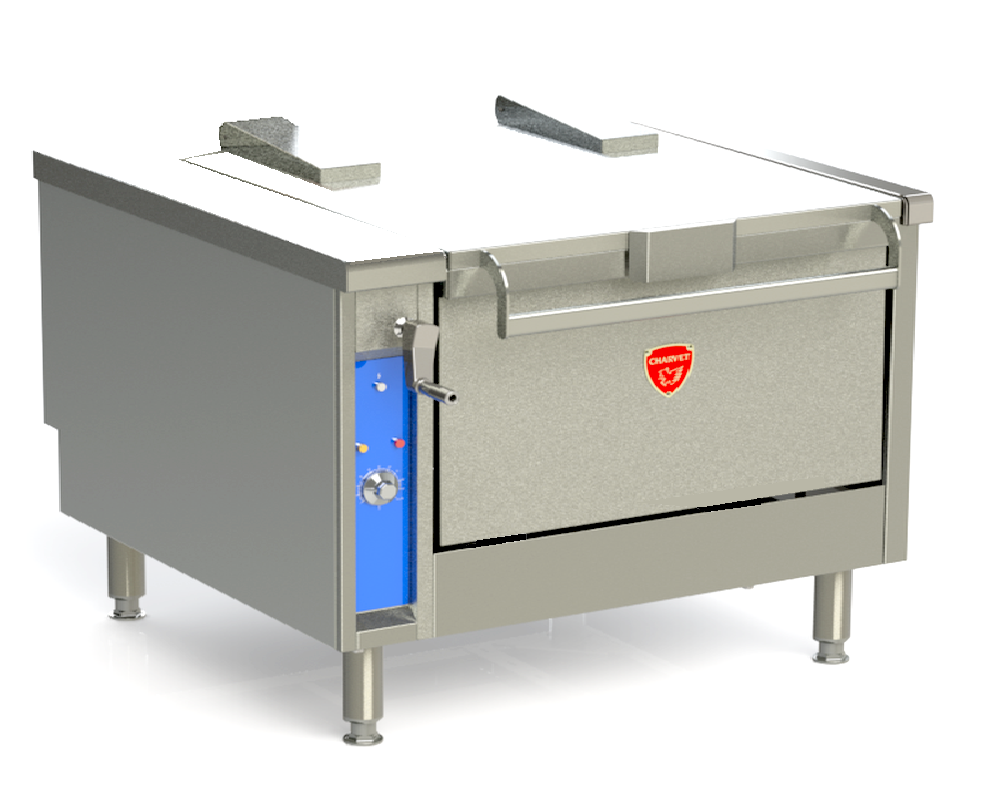 Cuve chauffée par châssis de résistances blindées plaquées sous le fond. Fonctionnement par bouton doseur d’énergie 0%/100% avec position « arrêt » ettémoins lumineux de contrôle de la mise sous tension et de la chauufe. Thermostat de sécurité de surchauffe à réarmement automatique. Tableau de commandes en acier émaillé, en position verticale en partie gauche de la façade de l’appareil.