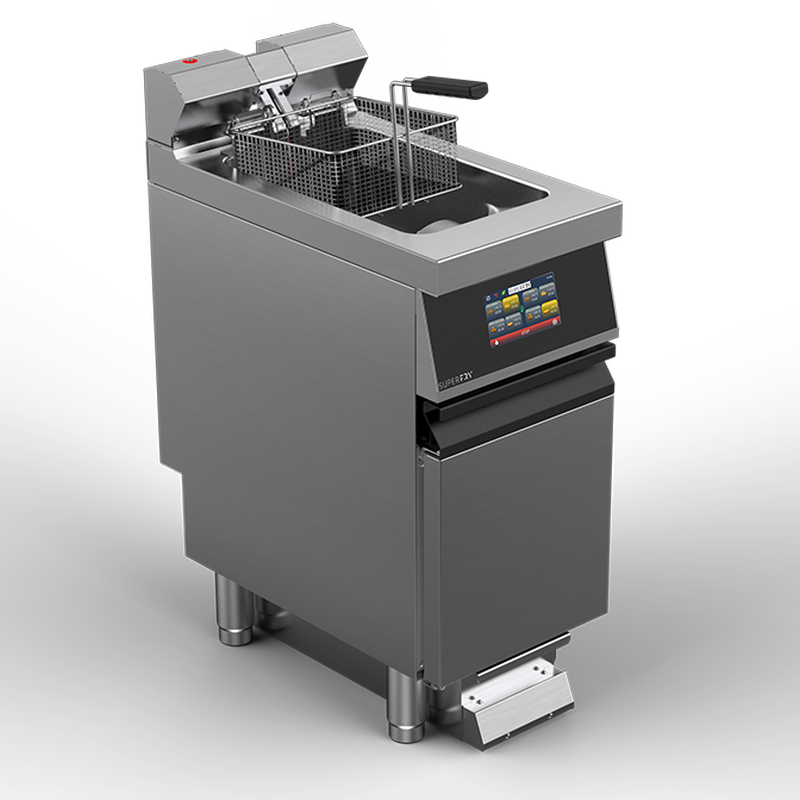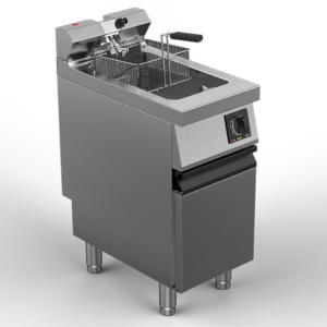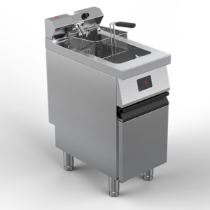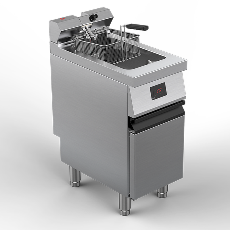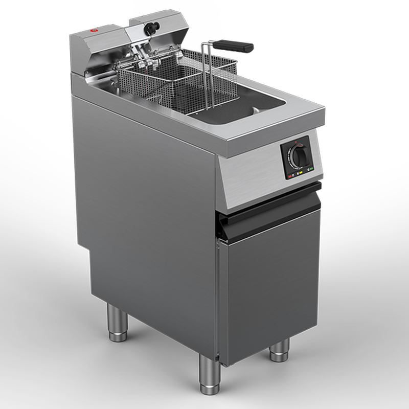 Modules friteuses électriques 1 cuve 15 litres sur placard. Modèles haute performance. Cuve à zône froide. 3 choix: friteuse standard à contrôle de température manuel, friteuse Fast à contrôle de température électronique, modèle Total Touch Screen à gestion électronique complète des paramètres de cuisson.