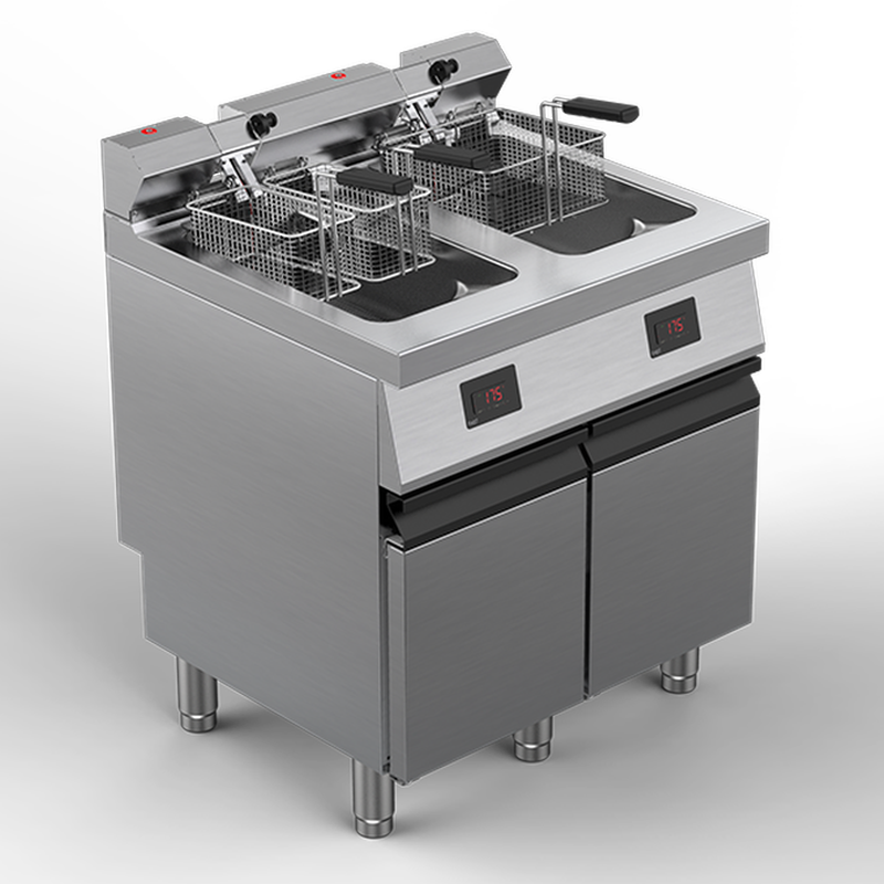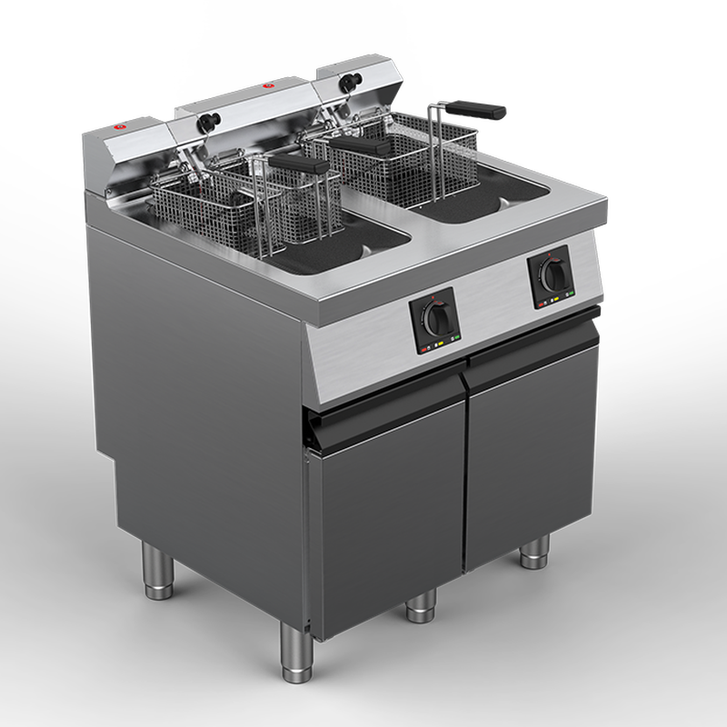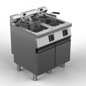 Bloc friteuse électrique haut rendement en gamme 700 largeur 800 mm. 2 cuves de 15 litres à cuve emboutie en Y à zône froide. Chauffage par bloc de résistances haut rendement spécifique, à profil plat adapté à la cuve pour un rendement optimal, basculant pour libérer la cuve au nettoyage. Gestion de température soit manuellement avec thermostat électronique, soit par écran digital…