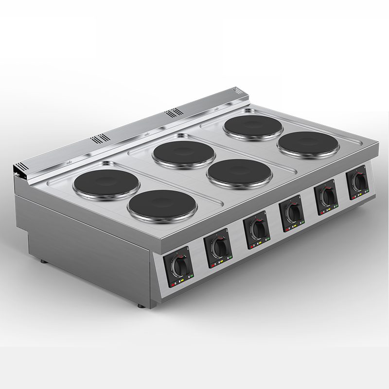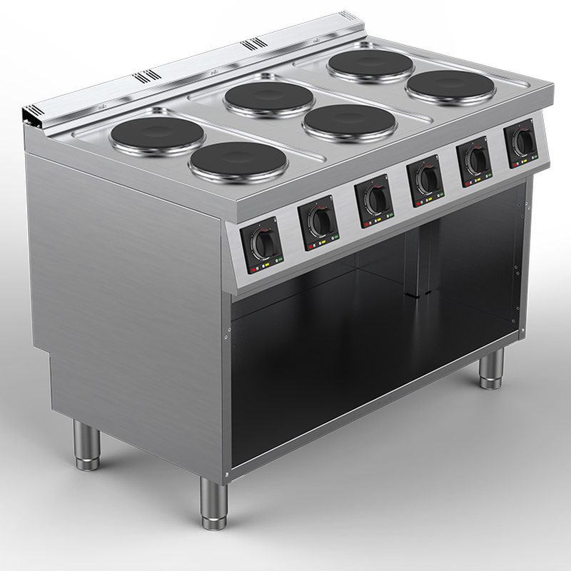 Modules professionnels électriques, dessus de cuisson 6 plaques rondes. 4 versions: dessus à poser, avec pieds réglables à base en plastique isolant anti rayures – posé sur support inox avec plancher, fermé sur 3 côtés – sur four électrique 3 GN 2/1 – sur maxi four électrique 3 niveaux de 3 GN 1/1.