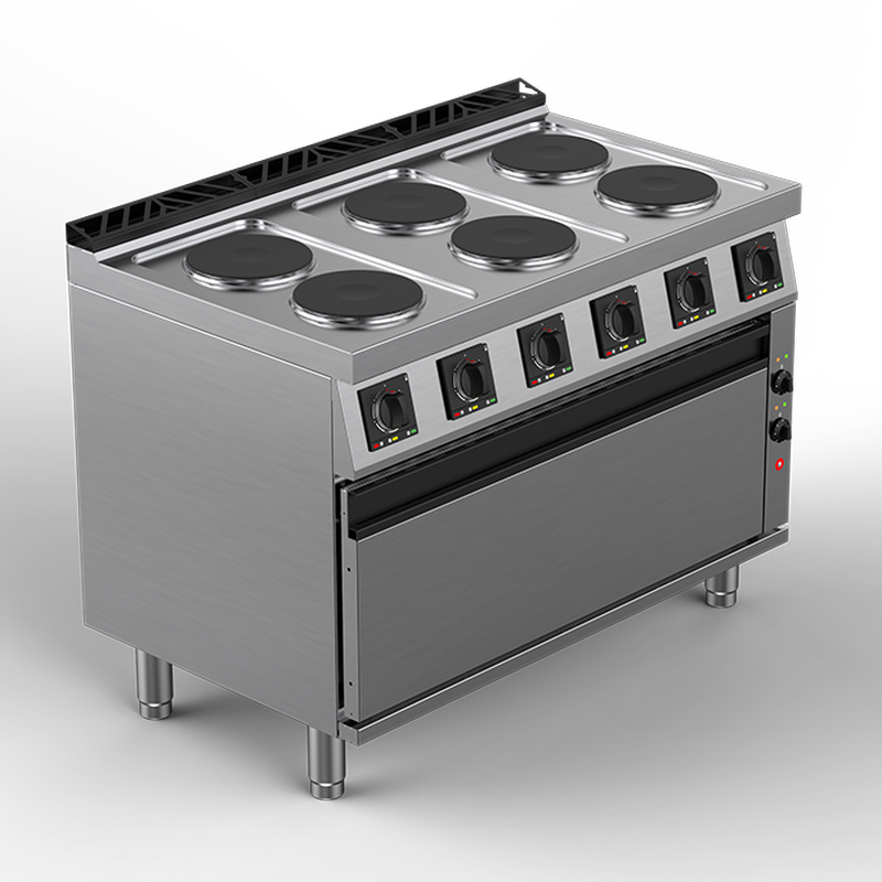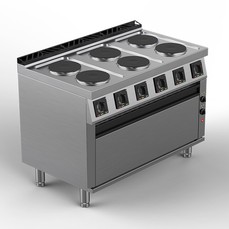 Plaques de cuisson en fonte embouties, étanches, avec zône circulaire anti débordement, Ø 220 mm. Puissance unitaire 2,6 kW. Boutons sélecteurs athermiques à 6 positions, sur plastrons anti traces, avec LED de fontionnement intégrées. Fours électriques statiques chauffés par résistances blindées à commandes séparées pour le haut et le dessous. Sélecteurs de température manuels sur bandeau latéral, de 50° à 300°C. Four standard: capacité 3 plaques ou grilles GN 2/1. Maxi four: 3 niveaux de glissières pour 3 plaques GN 1/1 par niveau. Montants à glissières démontables pour le nettoyage. Intérieur de four en acier inox AISI 304 épaisseur 1 mm. Isolation de porte par double paroi et joint caoutchouc pour une fermeture étanche.