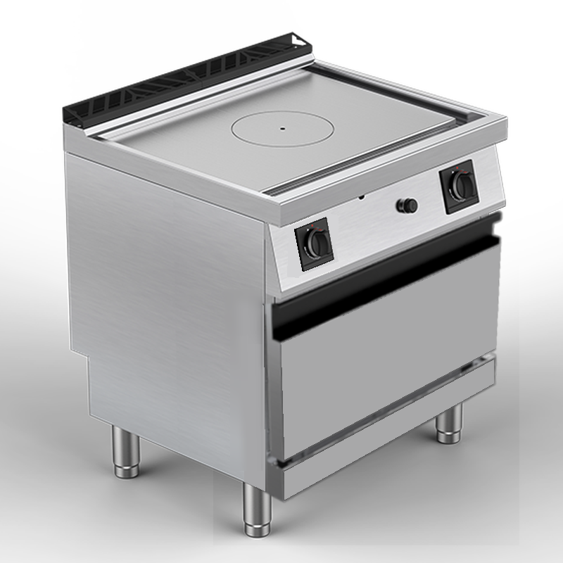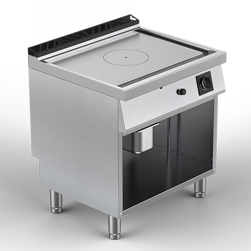 Plaque coup de feu gaz. Gamme 700, modules en largeur 800 mm. Plaque en acier avec nervurages, encastrée dans le plan de travail, Epaisseur 15 mm. Module décliné en dessus seul à poser, sur support placard inox sans porte, ou sur four gaz.
