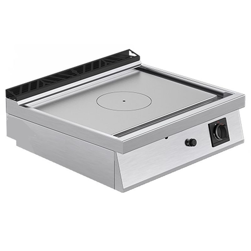 Plaque affleurante par rapport au plan de travail. Goulotte de propreté périphérique avec large trou d’évacuation des résidus sur bac inox de récupération amovible, au format GN 1/3. Foyer central avec anneau amovible de diamètre 290 mm, à température de 500°C. Dégradé de température isotherme du centre vers les bords de la plaque. Chauffage au gaz par brûleurs en fonte avec rglage en continu par robinet à vanne avec thermocouple de sécurité. Allumage piezzo.