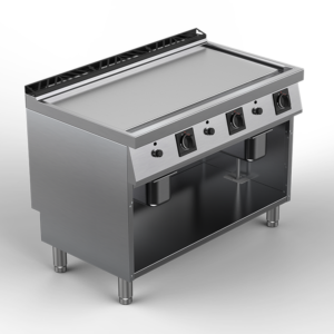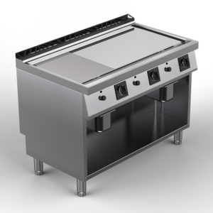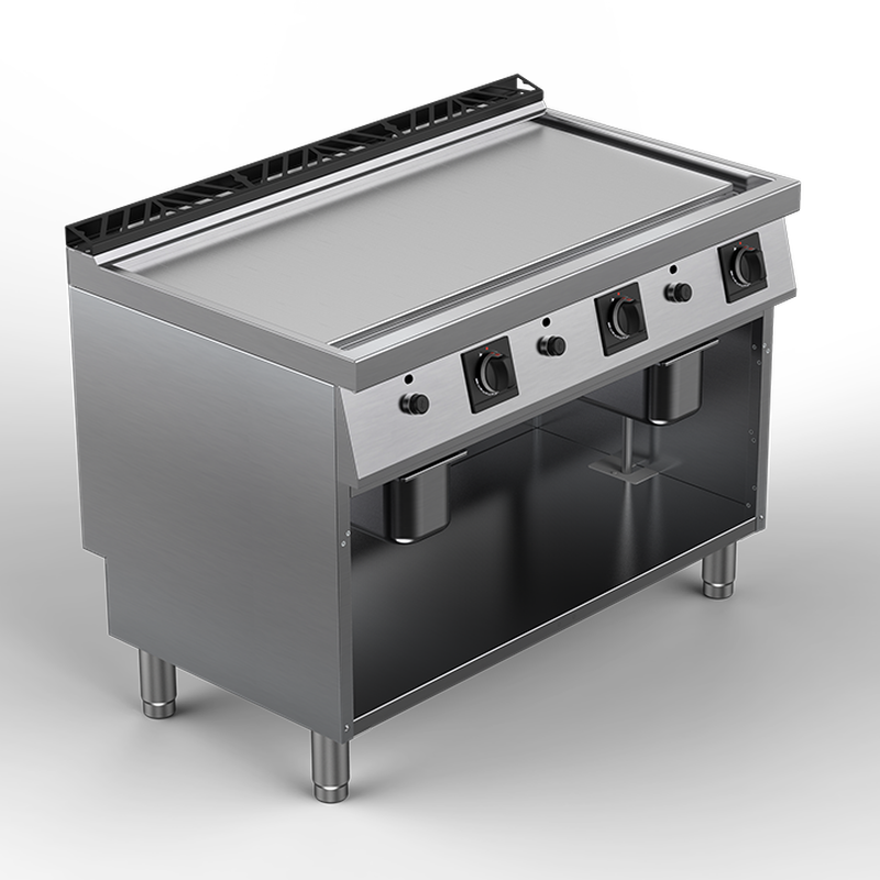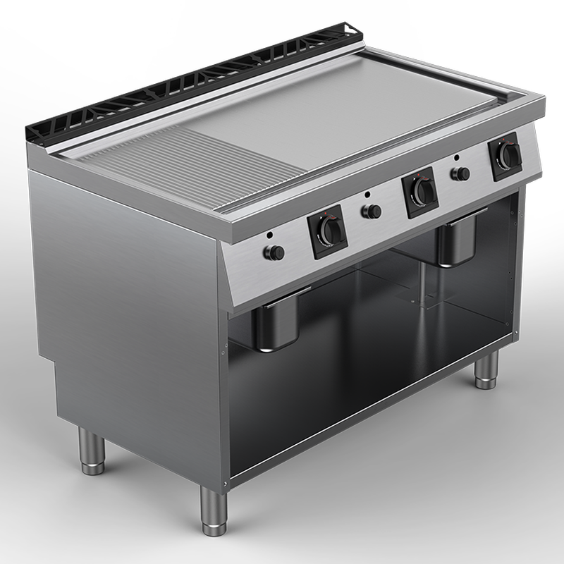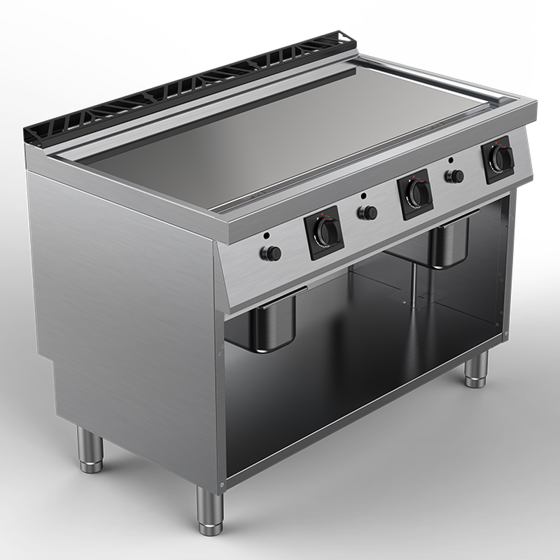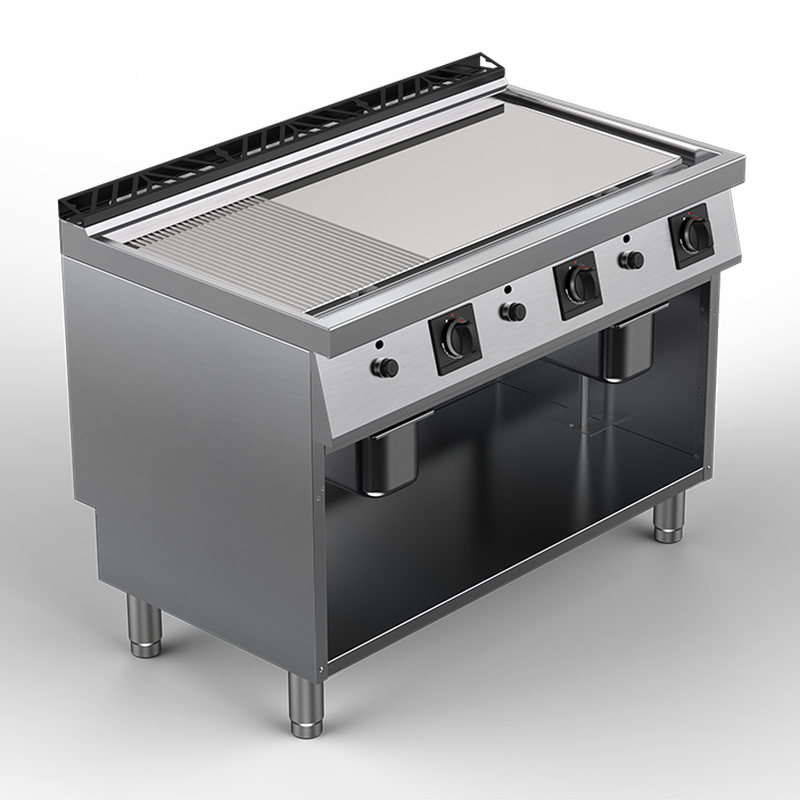 Blocs de cuisson gaz, dessus plaque grill chromée sur meuble de rangement neutre ouvert. Gamme de cuisson 700, éléments à 3 zônes de chauffe indépendantes, longueur 1200 mm. Configurations proposées: plaque lisse satinée – plaque lisse polie – plaque 1/3 nervurée satinée – plaque 1/3 nervurée polie.