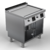 Construction intégralement en acier inoxydable AISI 304. Epaisseur du dessus 20/10°. Console de façade, habillages des côtés et panneau arrière en 10/10°. Châssis avec décrochement intérieur du dos en partie basse pour permettre le passage des alimentations. Dosseret arrière anti-éclaboussures incliné vers la plaque, et mitre d’évacuation des gaz brûlés, avec grille en acier recouverte d’un revêtement résistant à hautes températures, amovible. Support de rangement neutre inox AISI 304, avec plancher, sans porte. Pieds inox avec vérins.
