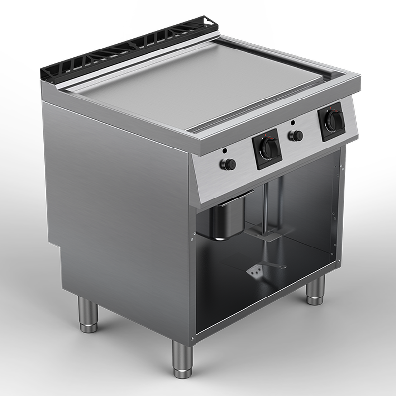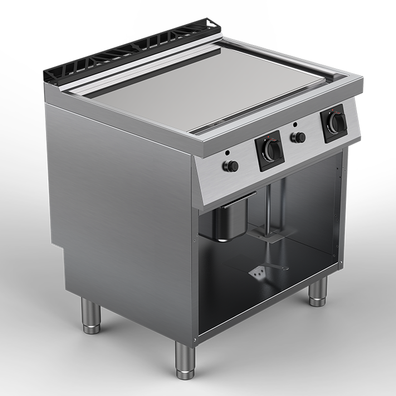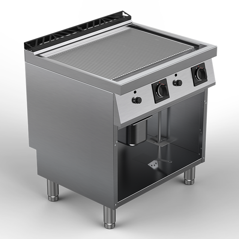 Plaque de cuisson acier de 15 mm d’épaisseur, encastrée, à niveau affleurant le plan de travail. Goulotte étanche d’évacuation des graisses brûlées sur le pourtour, avec large orifice vers bac de récupération inox GN 1/3 embouti amovible. Chauffe assurée par brûleurs gaz en acier inox à flamme stabilisée (1 brûleur par zône), tubulure conçue pour une uniformité de température de la zône de cuisson. Commandes individuelles par zône, avec robinet thermostatique de réglage d’intensité sur une plage de 100°C à 300°C, avec thermocouple de sécurité, boutons de commande ergonomiques en matériau athermique. Veilleuse par zône de chauffe, avec allumage électrique par piezo. Thermostat de sécurité à armement manuel.