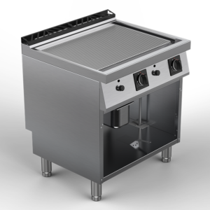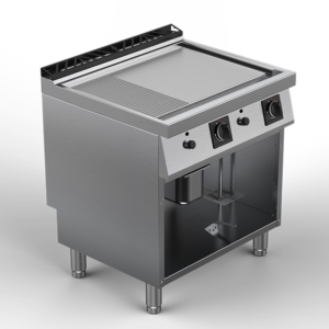 Modules de cuisson gamme 700 largeur 800. 2 zônes de cuisson. Dessus plaque snack chrome, lisse satinée ou polie, ou nervurée satinée ou polie sur 1/3 ou 3/3. Alimentation gaz, brûleurs inox, tubulures à géométrie favorisant une température uniforme. Réglage de température manuel par robinets thermostatiques, boutons athermiques. Commandes individuelles. Plaque acier de 15 mm encastrée…