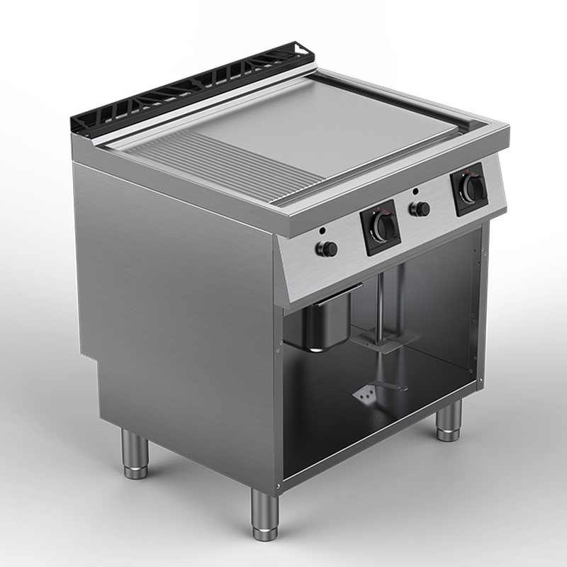 Plancha chrome Offcar gamme 700, modules de 800 mm. Energie gaz. Sur support placard neutre sans porte. Modèle poropsé ave plaque chromée lisse satinée ou polie, ou chromée nervurée satinée 1/3 satinée ou poli miroir, ou chromée nervurée 3/3 satinée. 2 zônes de cuisson indépendantes.