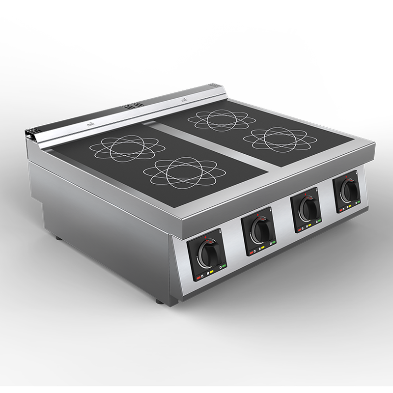 Modules de cuisson électriques Milo 700 4 foyers. Dessus plan de cuisson vitrocéramique extra résistant de 6 mm d’épaisseur. 2 x 2 foyers induction indépendants de 3,5 kW unitaire. Plaques affleurantes et étanches par rapport au plan de travail pour faciliter le nettoyage. Existent en dessus seul à poser sur plan de travail, avec pieds réglables à base plastique anti-rayure isolante, ou montées sur support placard neutre inox sans porte, avec plancher.