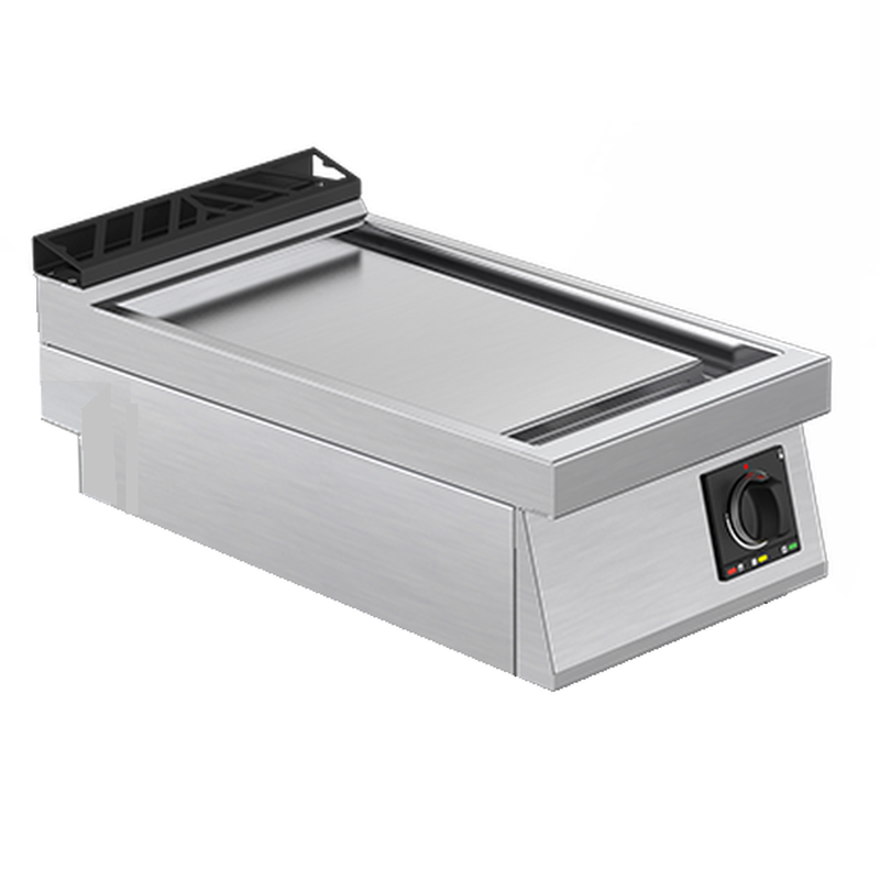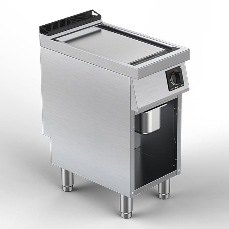 Plaque encastrée dans le plan de travail, affleurante, avec goulotte de propreté périmétale étanche et large trou d’évacuation vers un bac de récupération en acier inox embouti au format GN 1/3. Bac facilement amovible pour la vidange et le nettoyage. Zônes de cuisson différenciées (2 ou 4 selon module) avec contrôle indépendant de la température de 50°C à 350°C. Chauffage par éléments radiants en tungstène, pour la garantie de réaction rapide et de performances élévées. Régulateur d’énergie à 9 niveaux. Boutons de commande ergonomiques en matériau athermique sur plastrons avec indicateurs de fonctionnement LED intégrés.