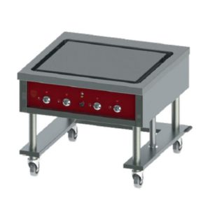 Charvet gamme XL Concept. Annexes de cuisson indépendantes planchas chrome sur support mobile. Energie gaz (plancha 1 zône), ou électrique (plancha 1 zône ou 4 zônes indépendantes. Dessus plaque de cuisson acier chromé avec goulotte périphérique de circulation d’eau. Dimensions de plaque: L 800 x P 600 , épaisseur 20 mm. Thermostat 350°C. Régulation manuelle…