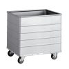 Construction en alliage léger anodisé résistant au lavage et à la désinfection. Parois nervurées avec perforations. Rebords supérieurs arrondis et fermés pour éviter l’accrochage du linge et le dépôt de salissures. Chariot équipé de 4 roues en caoutchouc multidirectionnelles de diamètre 100 mm, en disposition 1 + 2 + 1.