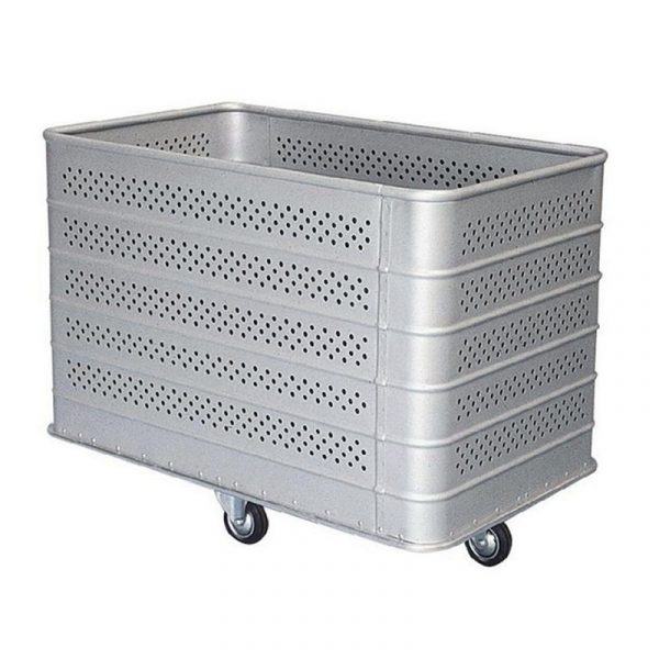 Chariot de manutention de linge propre du lave linge au sèche linge en blanchisserie. Construction aluminium anodisé, résistant au lavage et aux désinfectants. Parois perforées. 4 roulettes orientables diamètre 100 mm. Capacités de 305 litres à 555 litres.