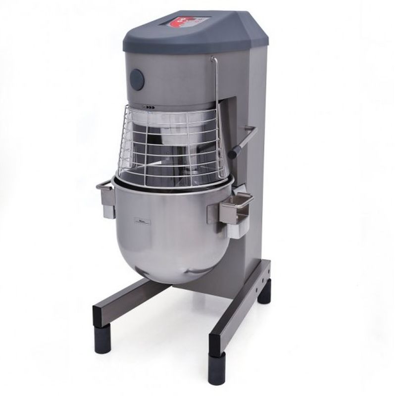 Batteur mélangeur professionnel planétaire, sur colonne. Capacité de cuve: 40 litres. Contenance: 12 Kg de farine avec 60% d’eau. Proposé en trois versions: sans prise d’accessoires sur colonne standard – sans prise d’accessoires sur colonne inox – avec prise d’accessoires sur colonne standard. Accessoires (non fournis): coupe légumes, hachoir à viande, presse purée.