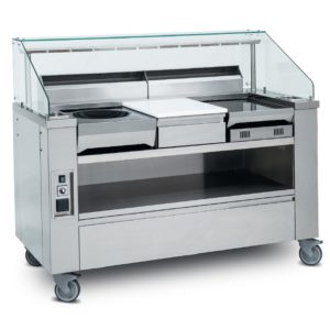 Meuble conçu pour la cuisson spectacle, permettant la disposition de modules de cuisson à poser, pour animations à thème en restauration notamment en self service commercial disposé en ilots (scramble) ou restauration d’entreprise. Extraction intégrée, évitant les dégagements de fumées ou d’odeurs. Prévu pour le branchement de 3 appareils « volants ». 2 modèles, avec ou sans tiroirs réfrigérés…