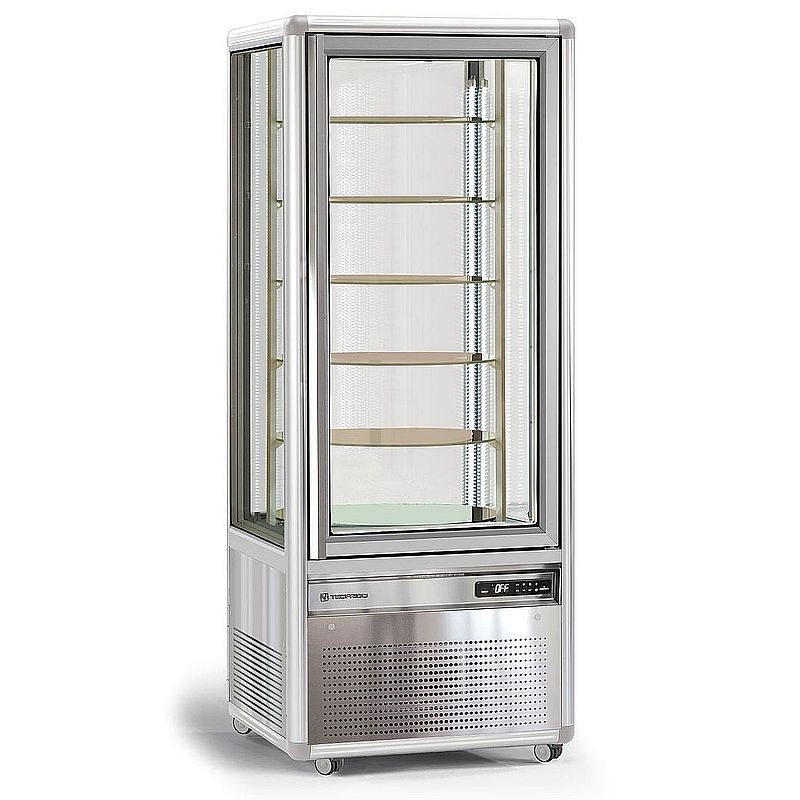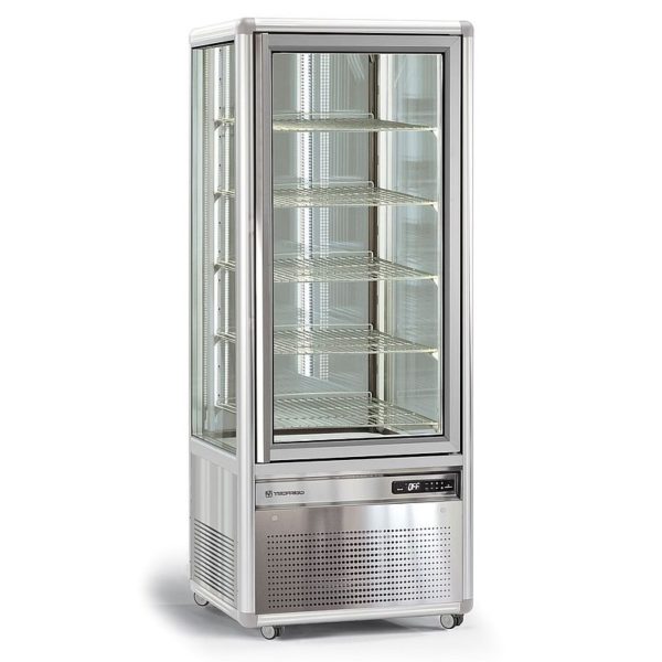 Vitrine réfrigére verticale, 4 faces (dont porte) vitrées, pour la mise en valeur de produits frais, pâtisseries en boulangerie pâtisserie, salon de thé, restaurant… Volume 500 litres. Froid ventilé positif. Gamme comportant 3 aménagements intérieurs, pour la disposition des produits soit sur 5 étagères verre de dimensions 560 x 555 mm redisposables en hauteur, soit sur 5 grilles inox de dimensions 560 x 555 mm réglables en hauteur, soit sur ensemble de 6 tablettes verre rotatives de Ø 535 mm.